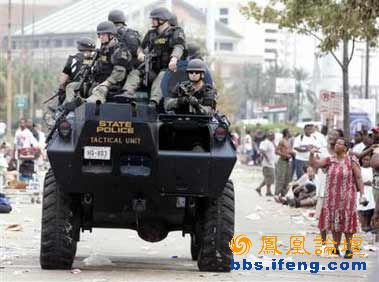 8月30号,新奥尔良开始发生大范围的武装抢劫和放火行为。当一名游客向警方求助的时候,得到的答复是"你去死吧!现在都是各顾各了。"(Go to hell, it''s every man for himself)。8月31号,1500名警察接到命令,放弃搜索幸存者,改为执行维护治安的任务。同时全程宣布宵禁。同日,女州长凯瑟琳-布兰科声称武装部队已经进入新奥尔良,并在电视上威胁说"他们对开枪和杀人很在行的。。。如果需要的话他们会的。。。"。至9月1号,已有6500名国民警卫队奉命赶到新奥尔良。9月2号,州长要求增派4万名国民警卫队参与救援和维护治安。最不可思议的是有人向救援的直升飞机和车队开枪射击。